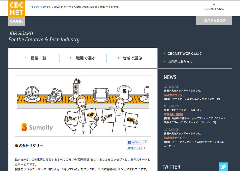 デザインポータルサイト『CBCNET』が運営する、デザイン関係に特化した求人情報サイト『CBCNET WORK』に、Sumallyの求人情報が掲載されています。