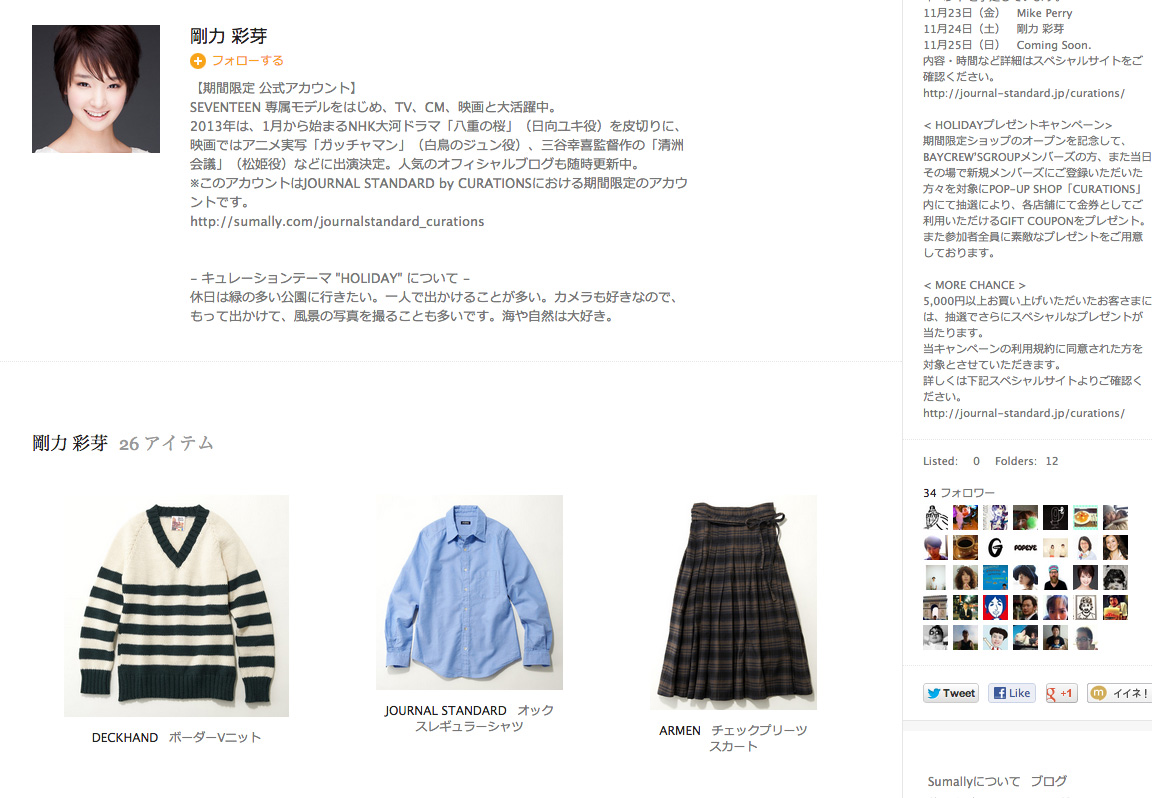 女優、作家、編集者、スタイリスト、モデルなど各界の著名人をCurator(キュレーター=選定者)として招き、「HOLIDAY」をテーマに各人がこよなく愛する音楽、映画、本とともにジャーナル スタンダードの新作アイテムを展示・販売するという豪華企画ですが、このキャンペーン用の特設Sumallyページがオープンしています。