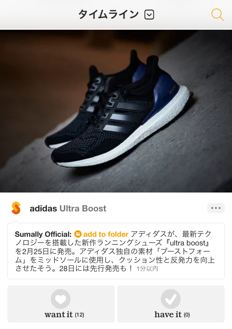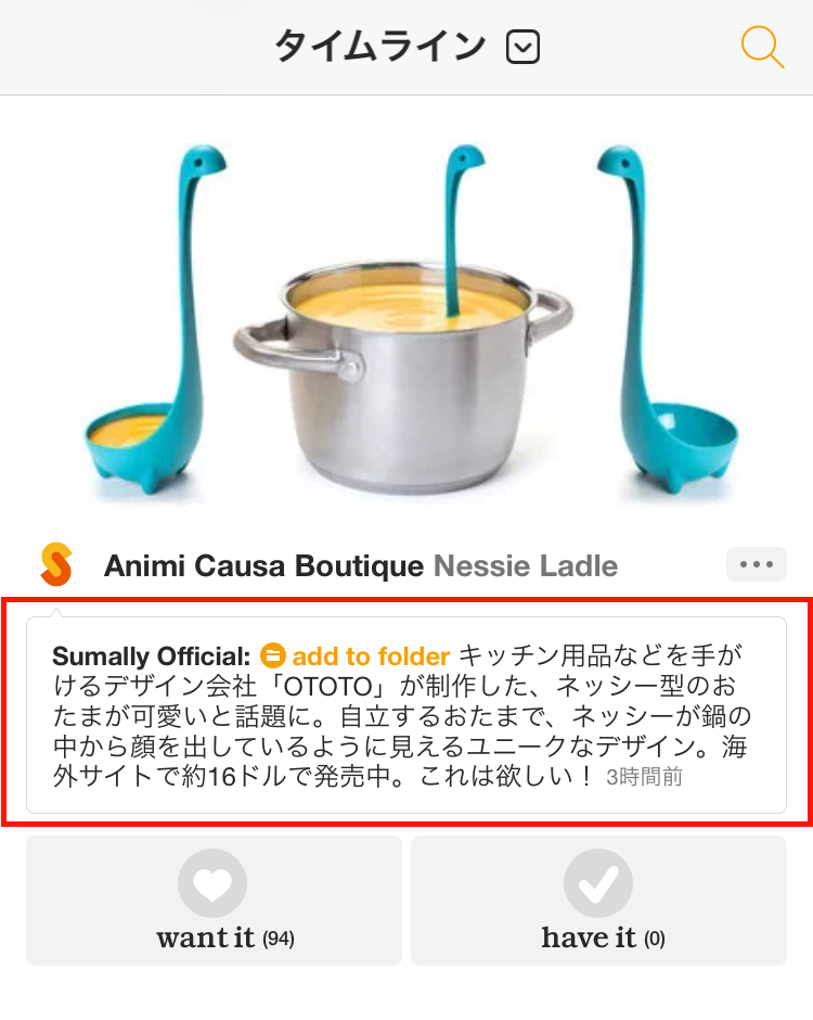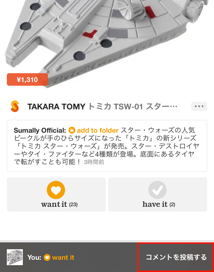 あなたが投稿したコメントは、“want”や“have”をしたアイテム情報と一緒に友だちのタイムラインに表示されます。