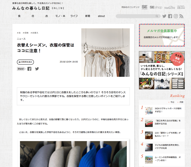 WEBメディア『みんなの暮らし日記 ONLINE』で、整理収納アドバイザー・中山真由美さんにサマリーポケットを使った衣替えの方法を提案いただいています。