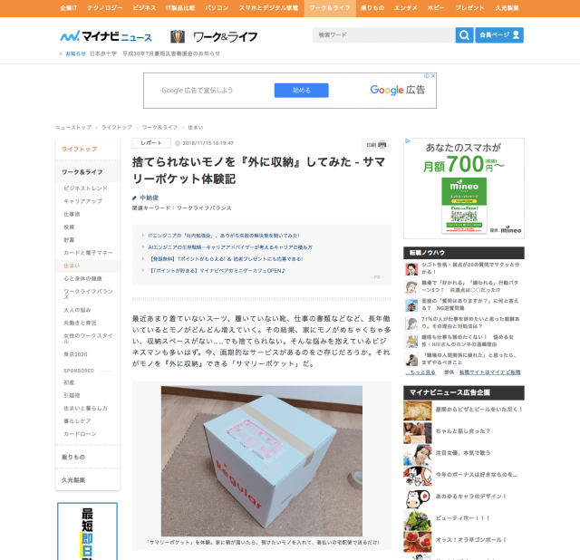 「マイナビニュース」で、サマリーポケット体験記事と代表・山本のインタビューを掲載いただきました。山本のインタビューでは「ビジネスマンが預けるとはかどるモノ」や「サマリーポケットを使った整理整頓」のメリットをお話ししています。
