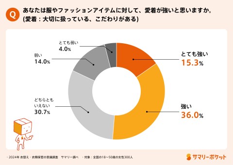 また、「あなたは服やファッションアイテムに対して、愛着が強いと思いますか?」と尋ねると、約半数(51.3%)が服やファッションアイテムに対して愛着が強いと回答しています。多くの女性がたくさんのアイテムを所持していながらもきちんと把握できており、ファッションに対して熱量が高いことが伺えます。