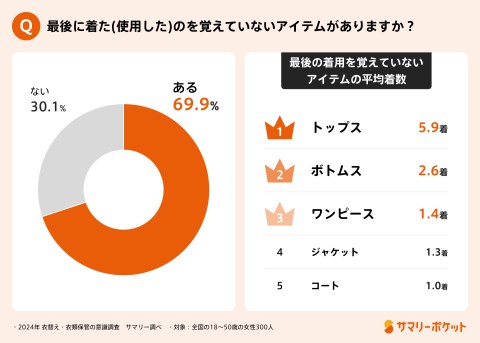 しかし約7割が「最後に着た(使用した)のを覚えていないアイテムがある」と回答。その平均着数については、トップス(5.9着)、ボトムス(2.6着)、コート(1.0着)、ワンピース(1.4着)、ジャケット(1.3着)という結果に。多くの女性が自身が所持しているファッションアイテムをきちんと把握していながら、複数枚を所持しているが故に、全てのアイテムを着まわせている人は少ないという実態が伺えます。