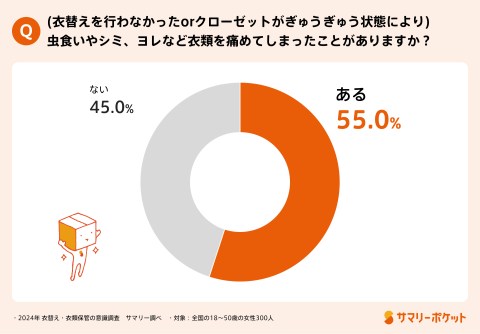 さらに約半数が、「(衣替えを行わなかったorクローゼットがぎゅうぎゅう状態により)虫食いやシミ、ヨレなど衣類を痛めてしまった」経験があると回答しました。
