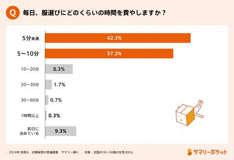 次に「毎日の服選びに費やす時間」について質問したところ、「当日10分未満」が79.7%と最も多く、「10〜60分未満」が10.7%、「前日に決めている」という人は9.3%となりました。