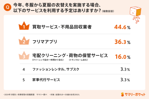 「今年、冬服から夏服の衣替えを実施する場合のサービス利用」について最も利用予定があるものは、買取サービスや不用品回収(44.6%)、フリマアプリ(36.3%)、次いで宅配クリーニングや荷物の保管サービス(16.0%)という結果になりました。