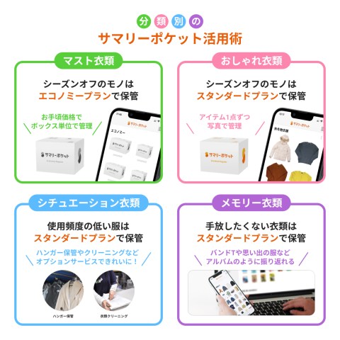 「マスト衣類」は時期が来たら必ず着るモノとなるためボックス単位でお手頃価格で保管できるエコノミープランを。「おしゃれ衣類」は新たに衣類を買う時にコーディネートを確認できるように、アイテムが1点ずつ写真でリスト化されるスタンダードプランを。また使う頻度が少ないシチュエーション衣類は、スタンダードプランでオプションサービスからクリーニングやハンガー保管を選びましょう。