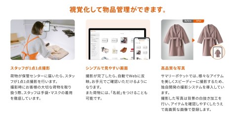 サマリーポケットは、1箱330円から利用可能な荷物保管サービスです。保管しているアイテムはプランによって1点ずつスタッフが撮影した写真での管理や、箱単位での管理ができ、荷物の出し入れは全国一律料金で、Webから依頼するだけで完結します。サマリーポケットでお預かりする荷物は、寺田倉庫・三菱倉庫と提携した信頼できる管理体制のもと、徹底した空調とセキュリティ管理を行なった保管センターで、厳重にお預かりいたします。