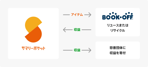 サマリーポケットに預けているアイテムを取り出すことなく、手放すことができるオプションサービスです。お申し込みされたアイテムは、当社からブックオフに引き渡され、リユース・リサイクルを通じて再活用されることで、循環型社会の実現に貢献します。またリユースによって発生した収益は、森林保護と子ども支援活動を行っている慈善団体を中心に寄付いたします。