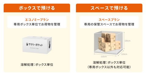 サマリーポケットは、専用ボックスに預けたい荷物を詰めて送る、月額1箱330円から利用可能な荷物保管サービスです。預けたアイテムを1点ずつスタッフが撮影した写真で管理できるプランや、箱単位での管理できるプランがあります。荷物の出し入れは全国一律料金で、Webから集荷・配送の依頼をするだけで完結します。サマリーポケットでお預かりする荷物は、寺田倉庫・三菱倉庫と提携した信頼できる管理体制のもと、徹底した空調とセキュリティ管理を行なった保管センターで、厳重にお預かりします。