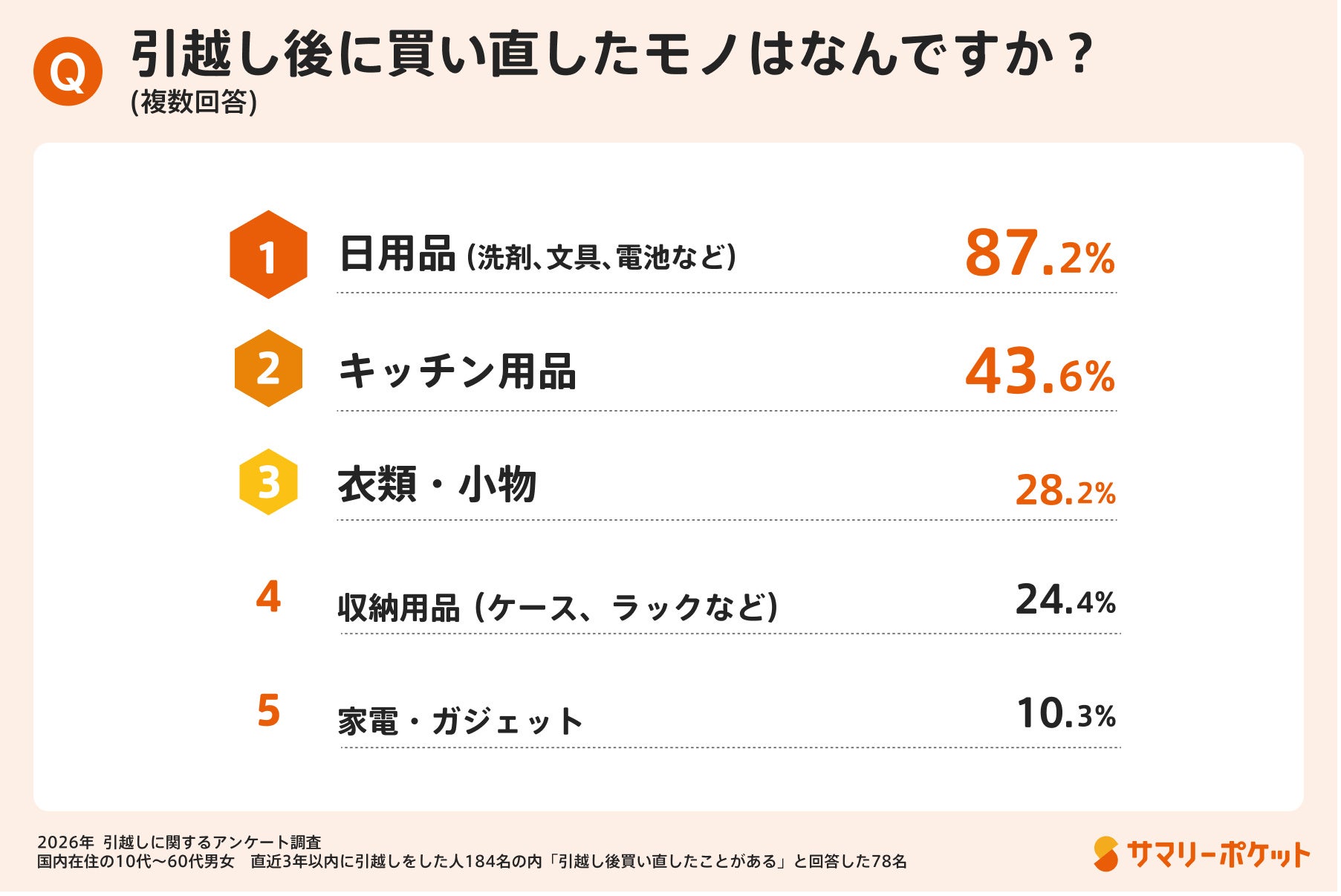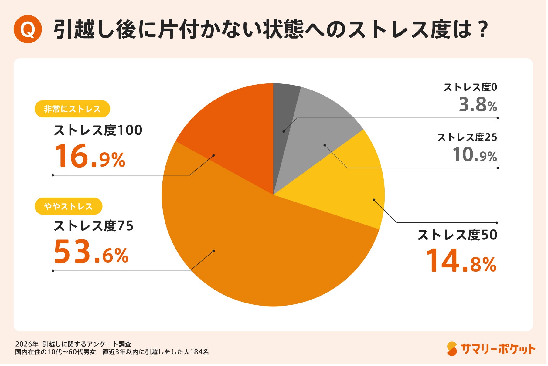 株式会社サマリーが運営する収納サービス「サマリーポケット」は、春の引越しシーズンに合わせて、直近3年以内に引越しをした全国の10代〜60代の男女184名を対象に「引越しに関する調査」を実施しました。